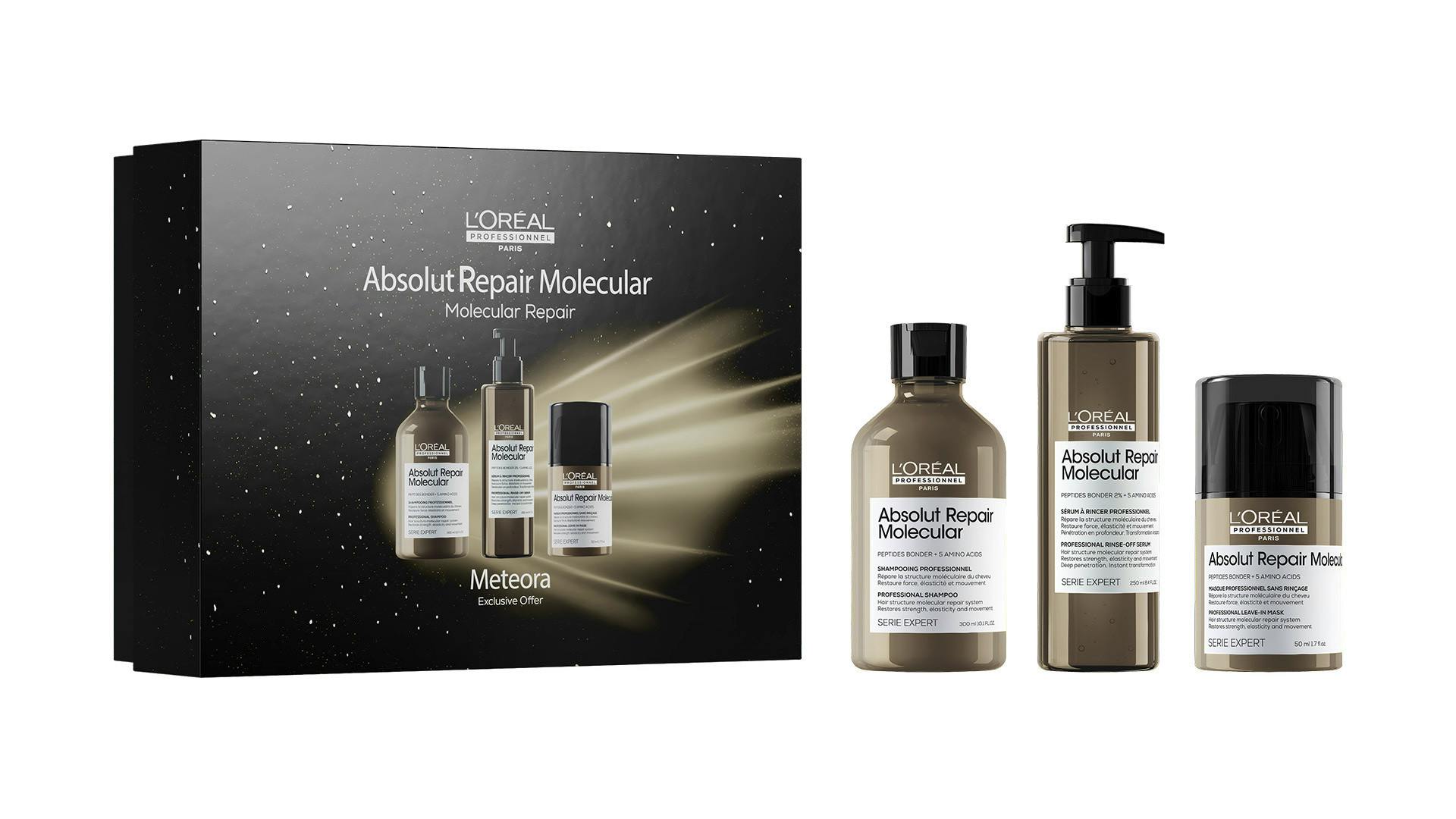 Spred julestemning med Serie Expert-hårpleje. Absolut Repair Molecular fra Serie Expert er en professionel hårplejeserie til skadet hår. TRIO-sættet indeholder tre produkter. Absolut Repair Molecular Shampoo 300 ml. Absolut Repair Molecular Rinse-off Seru