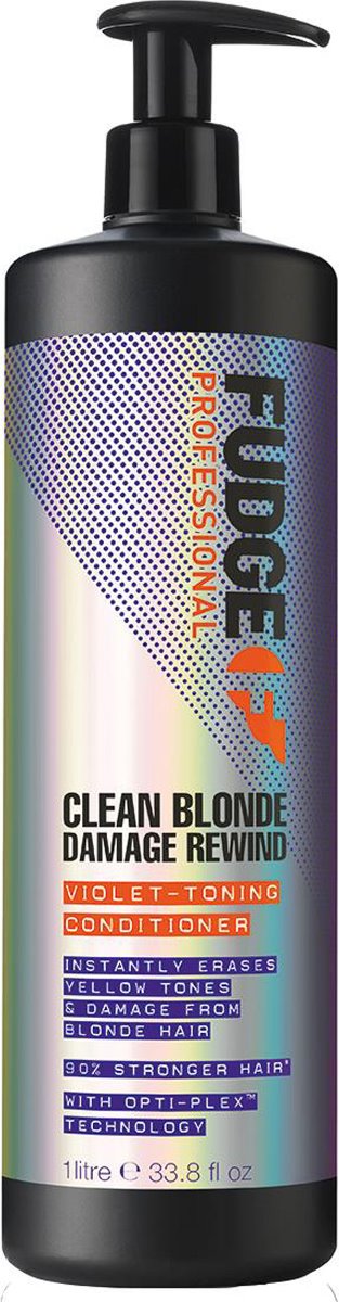 Fudge professional clean blonde damage rewind violet-toning conditioner 1 Liter En balsam med effektive violette mikropigmenter. Som umiddelbart bekæmper gule nuancer i blondt hår. Beriget med Opti-plex Technology. Som styrker og beskytter håret for at