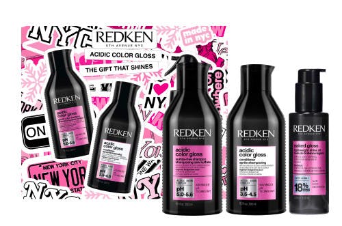 Oplev Redken Acidic Color Gloss Holiday Gift Set. Der indeholder. Redken Acidic Color Gloss Shampoo 300 ml. Redken Redken Acidic Color Gloss Conditioner 300 ml og vores bestseller Redken Acidic Color Gloss Leave-in 190 ml. Redken Acidic Color Gloss er vor